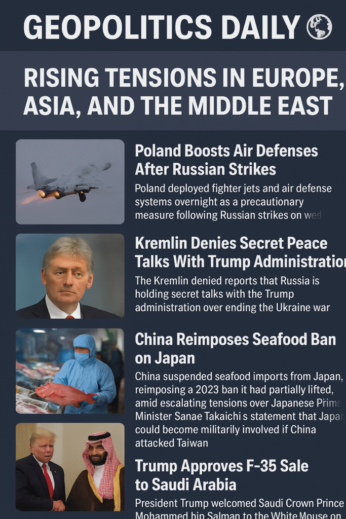 In the last 24 hours, several major world powers took significant political and military actions as tensions rose across Europe, Asia, and the Middle East. On Tuesday, November 19, 2025, Poland increased its air defenses after Russian strikes hit western Ukraine. Meanwhile, the Kremlin denied reports of secret peace talks with the United States. China reinstated a seafood ban on Japan after comments on Taiwan, and President Donald Trump met Saudi Crown Prince Mohammed bin Salman to announce a new F-35 fighter jet deal. Reports also say Trump approved CIA planning for covert operations in Venezuela. These developments highlight growing global uncertainty and shifting alliances.